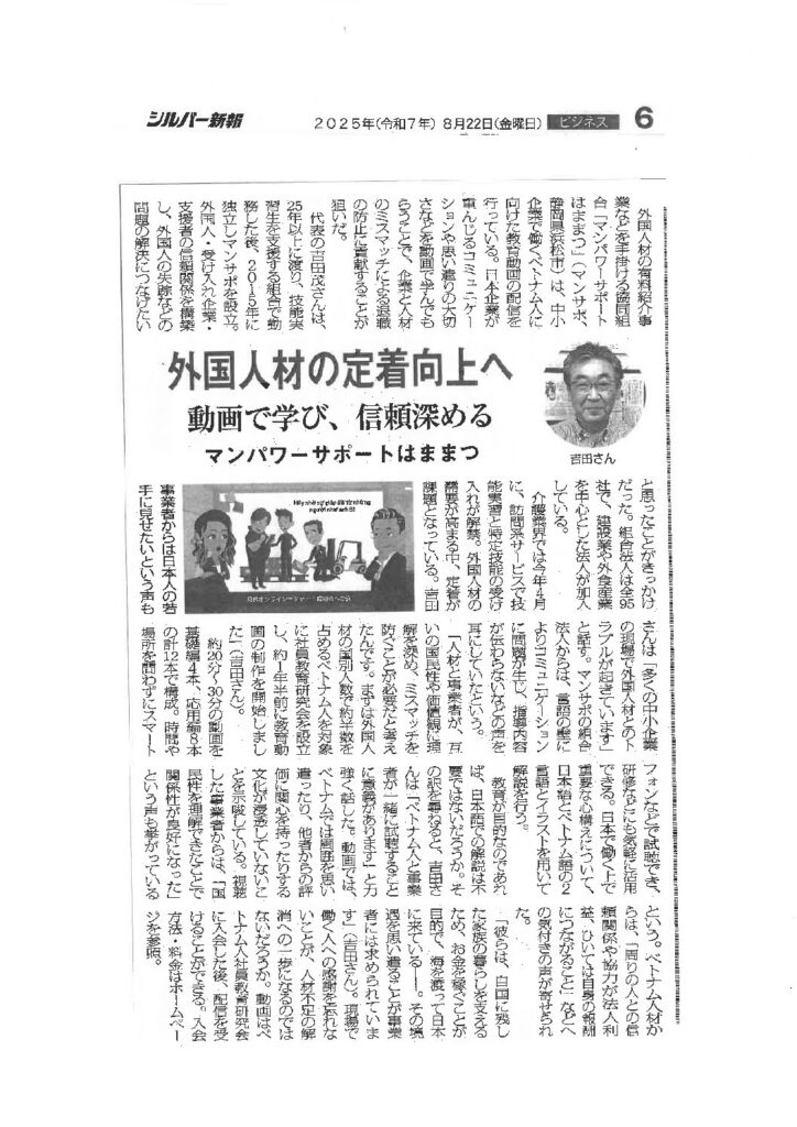 この度、シルバー新報様より取材のお問い合わせを頂き、「ベトナム人社員教育動画」を紙面とホームページでご紹介いただきました。